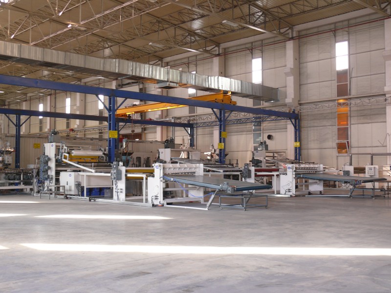Plastik levha üretimi ile ilgili tüm makinalar kendi imalatımız olup ABS, PS, HIPS, PE, HDPE ve PP gibi malzemelerin çekimine uygun olarak tasarlanmıştır. Saatte 500-600kg üretim kapasiteli, 3Co'lu 5 kat malzeme çekilebilir.